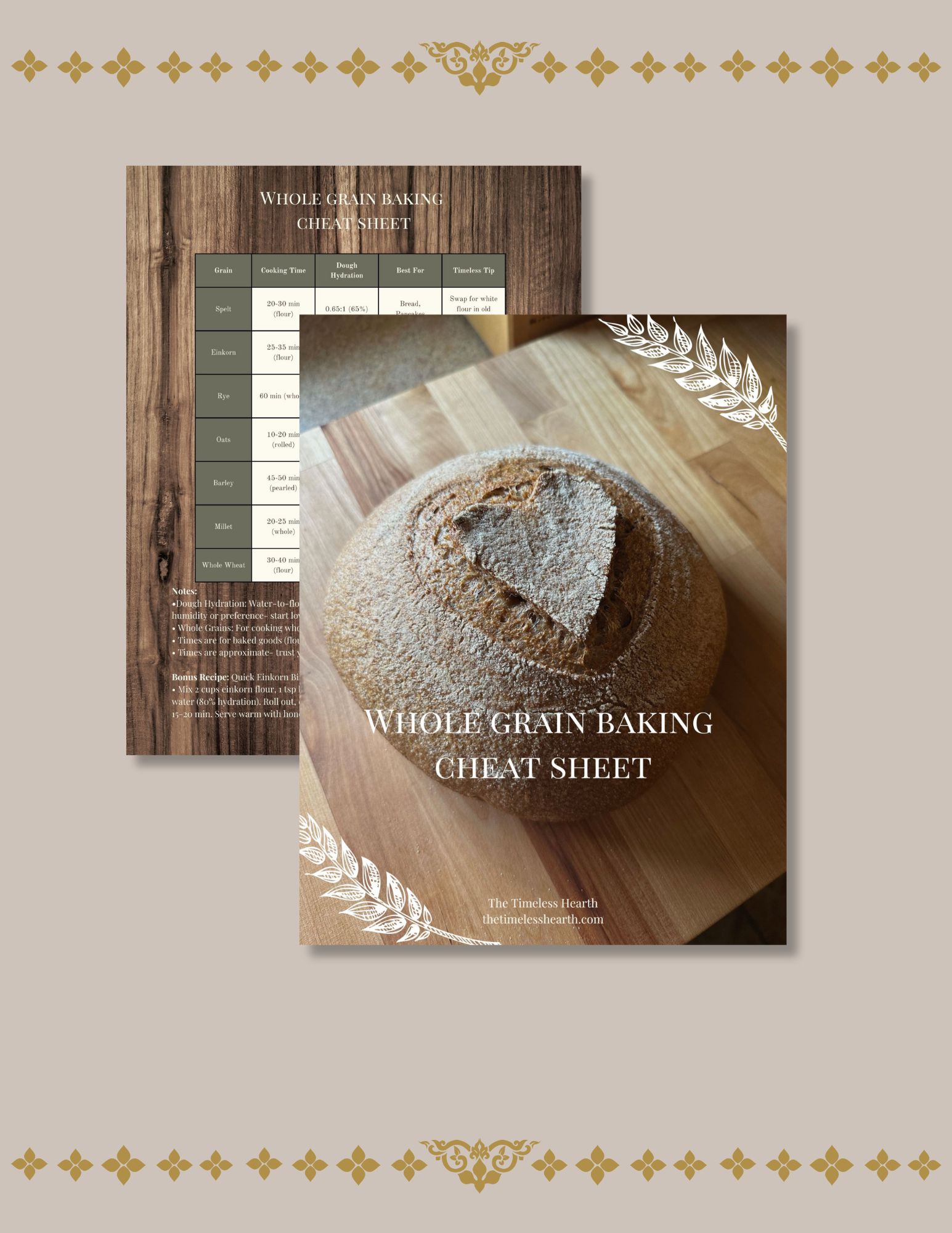 Love hearty, old-fashioned flavors? My Whole Grain Baking Cheat Sheet brings rustic grains like spelt, einkorn, and rye to your hearth. With simple ratios, a few timeless tips, and a bonus recipe, it’s your guide to cozy breads and more- straight from my sustainable kitchen to yours. Download it free and bake a little nostalgia!